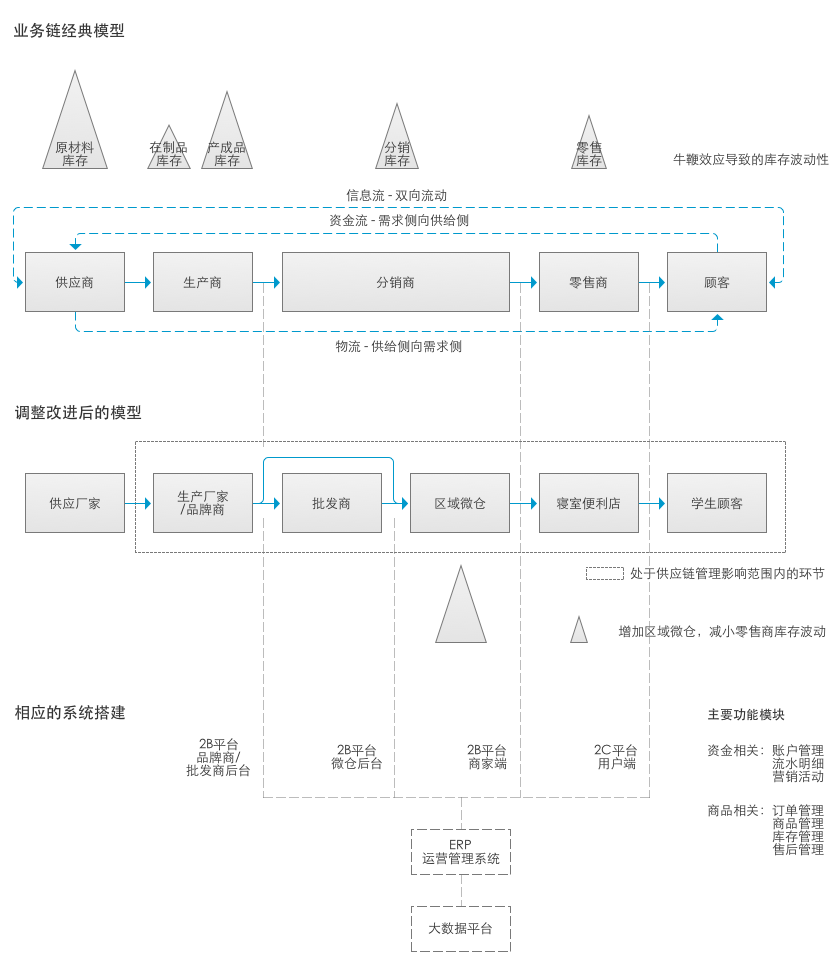 如上图所示,物流、资金流和信息流沿着业务链路组成的网络流动,不同类型的平台端则类似于链路中的关卡,对流动要素起到汇集、梳理、传递的作用。