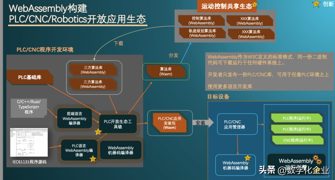 1.采用更先进的核心技术。用WebAssembly标准和技术作为PLC/CNC引擎,支持更多的开发语言生态(IEC61131-3,C/C++,Rust,TypeScript..),提供更好的运行性能、隔离性、安全性和可靠性。