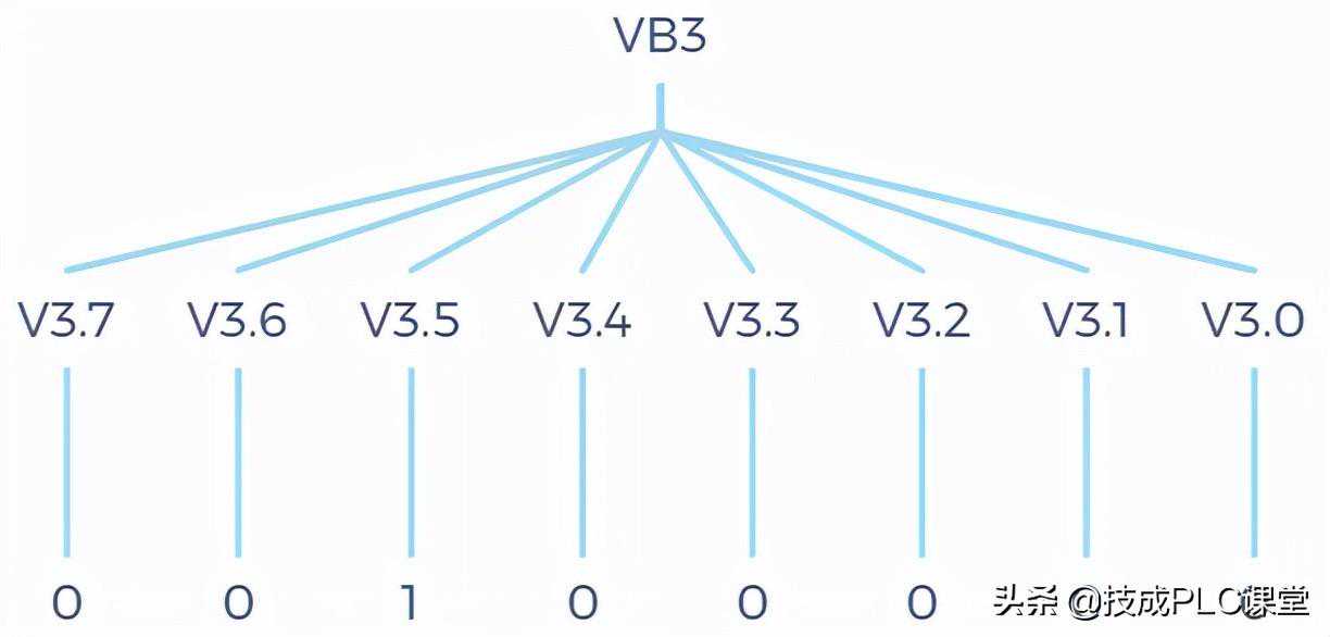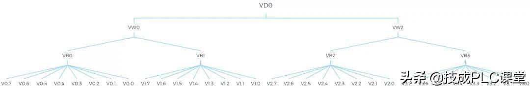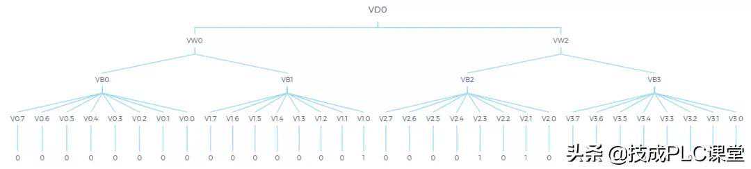 VD0:V存储区的双字0,包含VW0、VW2,包含VB0、VB1、VB2、VB3,VB0包含—的8个bit位,VB1包含—的8个bit位,VB2包含—的8个bit位,VB3包含—的8个bit位。VD0中是最高bit位,是最低bit位,VW0是高字,VB0是高字节,VB3是低字节。