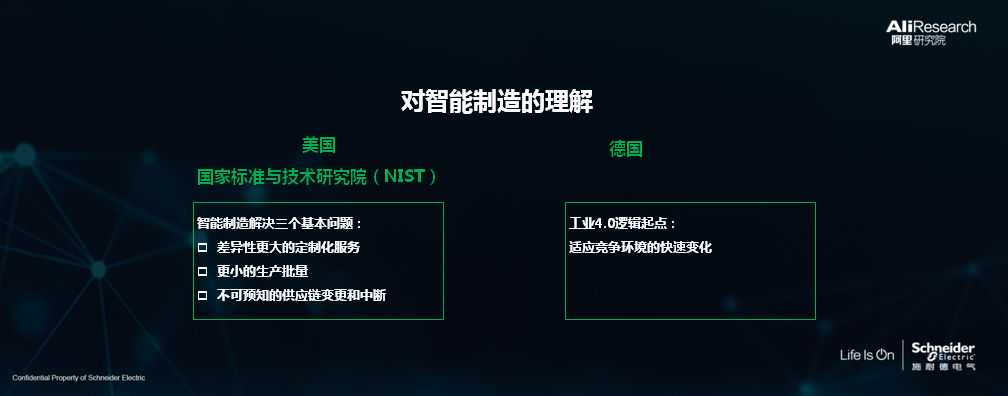 美国NIST在讲智能制造解决三个基本问题:差异性更大的定制化服务、更小的生产批量、不可预知的供应链变更和中断。如果把美国NIST对智能制造的理解概括为一句话,就是一个组织、一个企业、一个车间对外部环境的变化做出响应的能力。