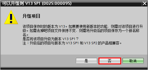 4.在TIAPORTALV13/V13SP1/V13SP2软件,上传V12/V12SP1的项目可以从这里下载一个TIAPORTALV12SP1的空项目,然后使用TIAPORTALV13/V13SP1/V13SP2打开该项目时,在弹出对话框选择中间的按钮“否”,这样打开的就是V12SP1的项目,然后就可以使用正常的方式上传。